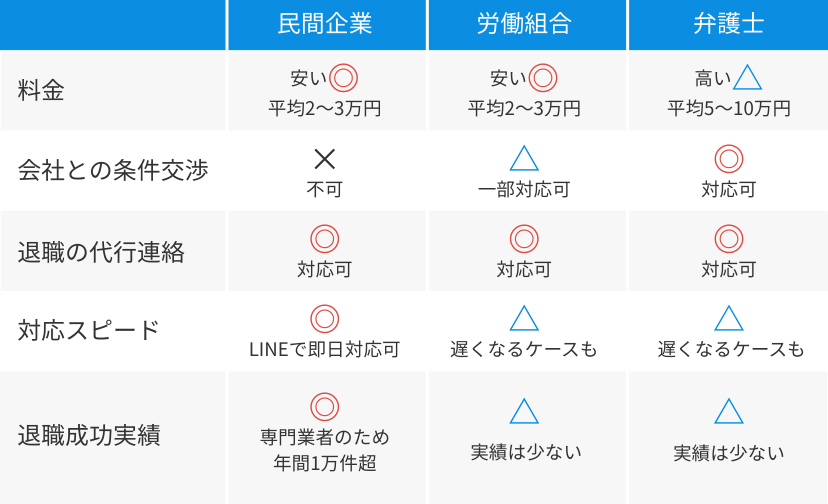退職の代行連絡や手続きのみであれば、民間企業の方が安く、実績も多く、即日対応可能なケースが多いため、あなたに最適な料金と求めるサービスが対応しているかどうかを注意して選ぶことをおすすめします。